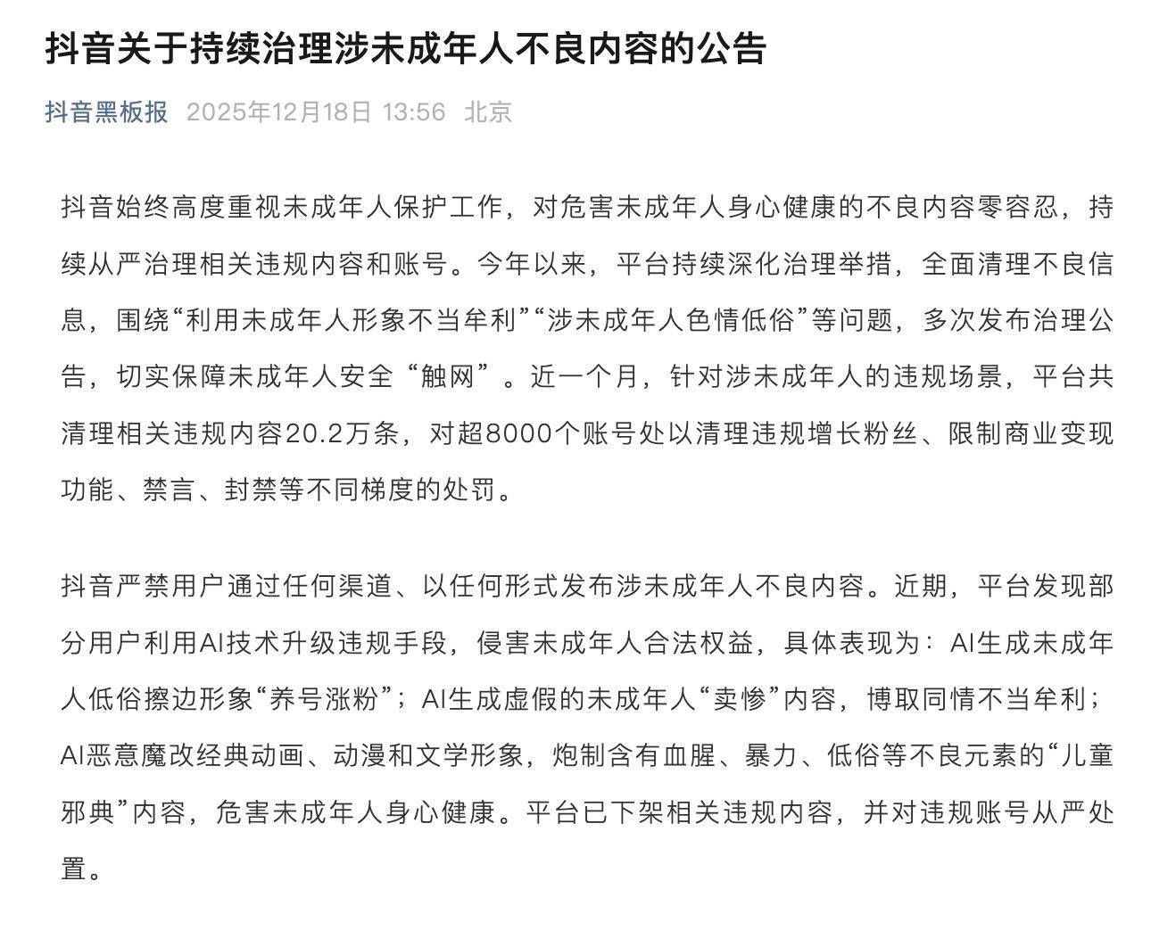 凤凰网科技讯 12月18日,抖音发布关于持续治理涉未成年人不良内容的公告并公布一批典型案例。公告提到,近一个月,针对涉未成年人的违规场景,平台共清理相关违规内容20.2万条,对超8000个账号处以清理违规增长粉丝、限制商业变现功能、禁言、封禁等不同梯度的处罚。